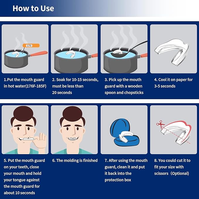 Get relief from teeth grinding and clenching with this comprehensive set of night guards. The pack includes 8 moldable mouth guards in two different sizes to ensure a comfortable, customised fit for your mouth. These guards are specifically designed to help with bruxism, protecting your teeth from damage caused by night-time grinding and clenching. The set comes with two convenient travel cases, making it easy to maintain your dental protection routine even when you're away from home. The moldable design allows you to create a personalised fit for optimal comfort and protection throughout the night. Whether you're dealing with occasional teeth grinding or regular clenching, these night guards offer a practical solution for protecting your dental health while you sleep.
