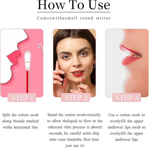 - 【How to use】 Split the cotton swab along the side marked by the horizontal line of the cotton swab, and let the cotton swab stand upright to allow the liquid to flow to the other end (this process is about 2 seconds, be careful not to drip onto your hands the first time you use it) , Use a cotton swab to evenly fill the upper and lower lips.